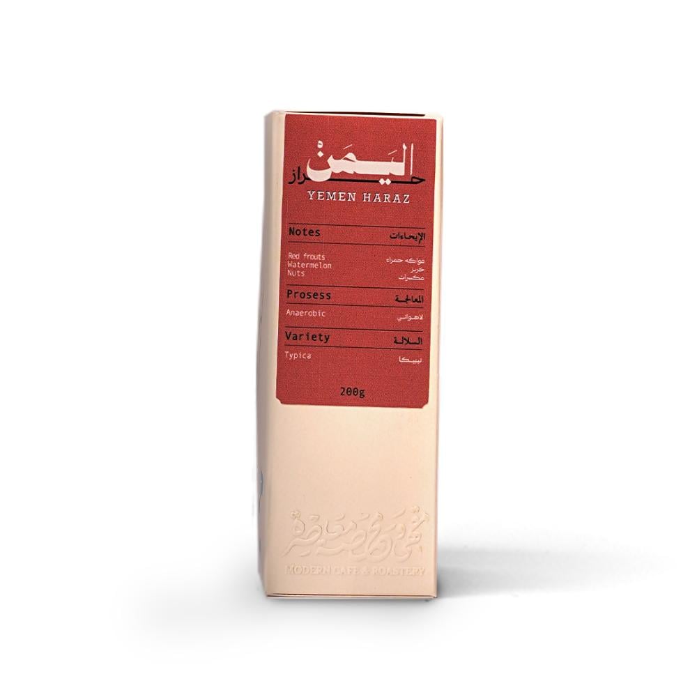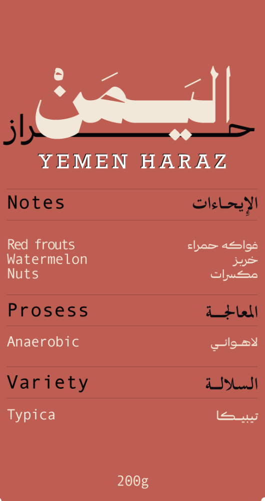 قهوة يمنية مميزة من أعالي جبال حراز ( اليمن ) تمت معالجته بالتخمير اللاهوائي لتعطينا طعم غني بالنكهات الفاكهية وحلاوة عالية من إيحاءات الخربز والفواكه الحمراء والمكسرات.